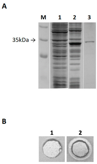 Expression and purification of the recombinant EstD04-His(6x) esterase protein and its lipolytic activity. (A) Lane M, protein marker. Lane 1, supernatant from crude lysate of BL21 (DE3) cells harboring plasmid pET21a+-estD04+-his(6x) without IPTG induction. Lane 2, supernatant from BL21 (DE3) cells harboring plasmid pET21a+-estD04+-his(6x) with IPTG induction to produce EstD04 esterase. Lane 3, purified EstD04-His(6x) protein eluted from the Co2+ affinity column. (B) Formation of halo zone on tributyrin (1%, v/v) agar plate. Panel 1, control with phosphate-buffered saline (PBS) added. Panel 2, a clear halo zone formed by the purified EstD04 esterase.