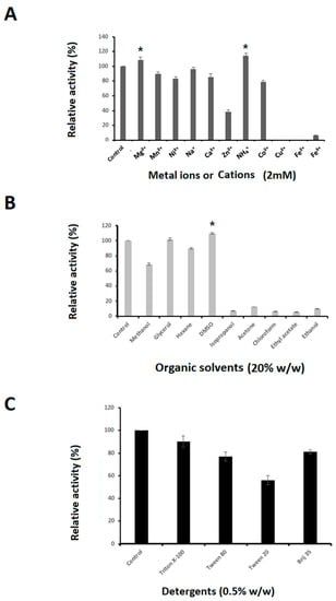 Effect of cations, organic solvents, and surfactants on EstD04 enzymatic activity. The enzymatic activity was determined using p-nitrophenyl butyrate (C4) as the sample substrate at 40 °C and pH 8.0. (A) Enzymatic activities of EstD04 in the presence of 2 mM cations, primary metal ions. (B) Enzymatic activities of EstD04 with addition of 20% (w/w) organic solvents. (C) Enzymatic activities of EstD04 with addition of 0.5% (w/w) surfactants. All enzyme activities are present as relative activity (%) compared to that of the control without addition of cations, organic solvent, or detergent. Error bars: standard deviation of the means. * The relative activity is significantly higher than the control (Student’s t-test, p-value < 0.05).