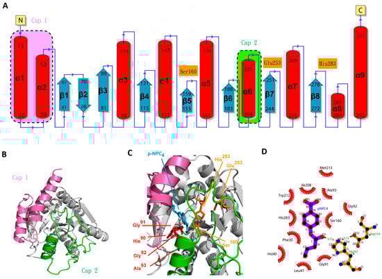 The proposed structures of EstD04 and p-NPC4-interactive complex. (A) Predicted secondary structure of EstD04. (B) Monomeric EstD04 with cap subdomain 1 (pink) and cap subdomain 2 (green). (C) Complex model of EstD04 with the substrate p-NPC4. The triad catalytic active site (i.e., Ser160, Glu253, and His283 residues) and a conserved motif, HisGlyGlyAla93 (oxyanion hole sequences), are indicated. (D) Ligplot+ analysis for the protein-substrate interaction of EstD04 and p-NPC4. The side chains of EstD04 and p-NPC4 are shown in a ball-and-stick 2D model, with p-NPC4 colored in purple and amino acid residues colored in orange. Hydrogen bonds are illustrated as green dotted lines, and red spoke arcs represent protein residues that form hydrophobic links with p-NPC4 atoms. Red balls represent oxygen atoms, black balls represent carbon atoms, and blue balls represent nitrogen atoms.