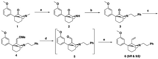 General route for the synthesis of the 9R and 9S-alkenyl intermediate (6). Reagents and conditions: (a) 1. CNBr, K2CO3, MeCN, reflux 4 h, 2. 3 N aq HCl, MeOH, reflux 16 h; (b) Ph(CH2)2Br, K2CO3, MeCN, reflux 16 h; (c) LiHMDS (methoxymethyl)triphenylphosphonium chloride, THF, 0 °C; (d) 6 N aq HCl; (e) Wittig conditions.