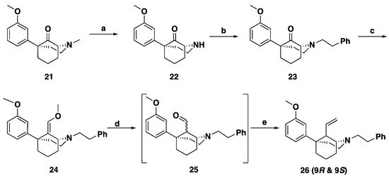 Synthesis of 1R,5S enantiomers (26, 9R & 9S). Reagents and conditions: (a) 1. CNBr, K2CO3, MeCN, reflux h, 2. 3 N aq HCl, MeOH, reflux 16 h; (b) Ph(CH2)2Br, K2CO3, MeCN, relux 16 h; (c) LiHMDS (methoxymethyl)triphenylphosphonium chloride, THF, 0 °C; (d) 6 N aq HCl; (e) Wittig conditions.