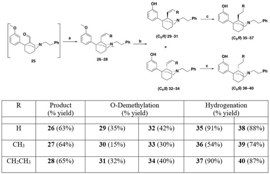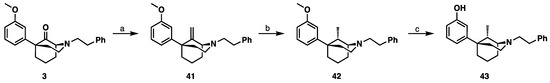Resynthesis of 9S-methyl-1S,5R-5-phenylmorphan (43) [11]. Reagents and conditions: (a) Tebbe’s reagent, THF, 3 h; (b) H2, Pd/C, MeOH, quant; (c) BBr3, CH2Cl2, 4 h.