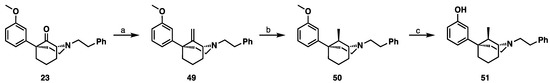 Synthesis of 9R-methyl-1R,5S-5-phenylmorphan (51). Reagents and conditions: (a) Tebbe’s reagent, THF, 3 h; (b) H2, Pd/C, MeOH, quantitative; (c) BBr3, CH2Cl2, 4 h.