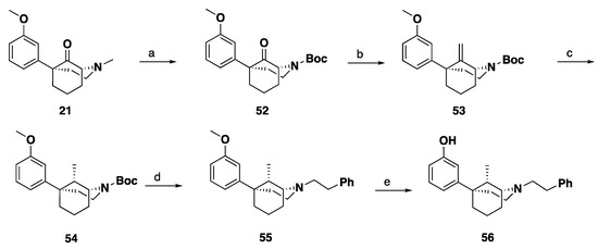 Synthesis of 9S-methyl-1R,5S-5-phenylmorphan (56). Reagents and conditions: (a) 1. Cyanogen bromide, K2CO3, CH3CN, HCl, 16 h; 2. Et3N, 4-dimethylaminopyridine, di-tert-butyl decarbonate, MeOH, 1 h; (b) Tebbe’s reagent, THF, 16 h; (c) H2, Pd/C, MeOH; (d) 1. TFA, CH2Cl2, 1.5 h; 2. Phenethyl bromide, K2CO3, CH3CN, 16 h. (e) BBr3, CH2Cl2, 4 h.