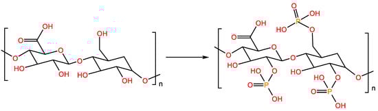 Phosphorylated polysaccharides are widely distributed in nature and have complex structures. The types of natural phosphorylated polysaccharides are limited; hence, polysaccharides are often structurally modified to prepare fresh phosphorylated polysaccharides [29]. In the phosphorylation reaction, the hydroxyl groups of polysaccharides are replaced with phosphate groups. Phosphorylation introduces a dotted phosphate group, which changes the molecular weight of the polysaccharide and the conformation of the sugar chain, further increasing its water solubility [30]. Anhydrides, phosphorus oxychloride, phosphate and phosphorus pentoxide are usually used for the phosphorylation of polysaccharides (Figure 3).