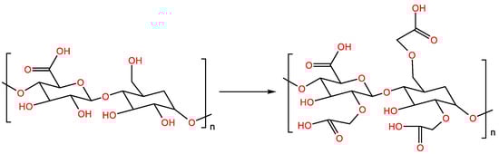 The carboxymethylation of polysaccharides serves to replace the hydroxyl groups of polysaccharides with carboxymethyl groups in order to change the conformation of polysaccharides (Figure 4), thereby enhancing the water solubility of the polysaccharides and further improving their biological activity [36]. The carboxymethylation reagent was prepared by adding chloroacetic acid to 20% NaOH and isopropanol. The polysaccharide powder was suspended in isopropanol and stirred for 30 min, and then 20% NaOH was added and stirred at room temperature for 3 h. Finally, carboxymethylation reagent was added while stirring and left to react at 60 °C for 4 h, and carboxymethyl polysaccharide was obtained via ethanol precipitation [37]. The DS is most affected by chloroacetic acid, and the amount of chloroacetic acid added is considered during preparation to prepare carboxymethyl polysaccharides [38].