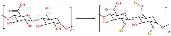Selenium is an essential trace element for the growth of various organisms and has biological activities such as anti-oxidation, hypoglycemic, and hypolipidemic functions [39]. However, the toxicity of inorganic selenium is much higher than that of organic selenium. Natural selenium-containing polysaccharides exist in plants or microorganisms in low concentrations. Selenium polysaccharide is a new type of functional polysaccharide, which combines inorganic selenium and organic selenium formed by polysaccharides [39]. The selenization methods of polysaccharides mainly include the use of sodium nitrate selenite [40], nitric acid–selenous acid [41], glacial acetic acid–selenous acid, glacial sodium acetate–sodium selenite and selenium oxychloride [42]. The sodium nitrate selenite method is commonly used in the selenization of polysaccharides because of its simple reaction conditions and high selenization efficiency. One adds polysaccharide powder to HNO3, followed by stirring at room temperature for 0.5 h, and then adds Na2SeO3 and BaCl2. The mixture is heated at 75 °C for 8 h, neutralized with NaOH, and ethanol-precipitated to obtain selenized polysaccharides (Figure 5) [43].