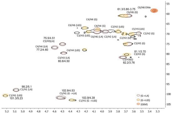 NMR can clearly reveal the structure of the modified polysaccharide [63]. Based on a combination of monosaccharide composition analysis and methylation analysis, the chemical shifts generated by anomeric carbon and anomeric hydrogen were analyzed. According to the monosaccharide composition, the one-dimensional nuclear magnetic resonance spectrum was used to analyze the relevant chemical shift, combined with the two-dimensional nuclear magnetic resonance spectrum to analyze the relationship between 13C-1H and 1H-1H. Finally, the linking sites between the monosaccharides were determined to obtain the accurate structure of the modified polysaccharides. By comparing the structural changes in the polysaccharides before and after modification, the reasons for the changes in their biological activities were analyzed, which laid the foundation for the study of the chemical modification of the polysaccharides (Figure 9).
