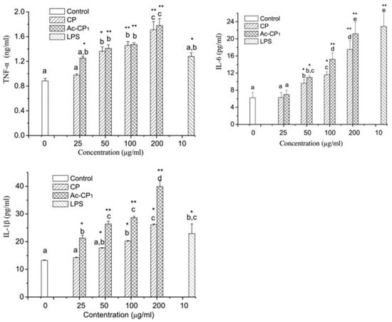 Acetylated polysaccharides of C. paliurus can promote IL-1β, IL-6 and TNF-α secretion by mouse macrophages [12].*: p < 0.05; **: p < 0.01; a, b, c, d, e represents different values, a < b <c < d < e.