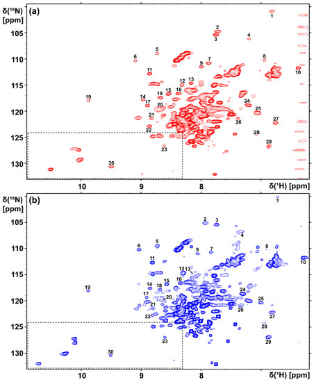 (a) Indole 15N–1H proton chemical shift distribution of ~9100 tryptophan residues in the Biological Magnetic Resonance Bank (BMRB) (https://bmrb.io/, accessed on 23 April 2023). (b) Overlay of the spectral region containing tryptophan indole 15N–1H signals (dotted rectangle in Figure 2a,b and Figure 3a) of the complex of [u-15N, ~70% 2H]-A2AAR with the inverse agonist ZM241385 in LMNG/CHS (20:1) micelles (red) and MSP1D1ΔH5 (POPC/POPS 7:3) nanodiscs (blue). For each residue, cross-sections along the 1H chemical shift axis at the dashed lines are shown in the bottom five panels.