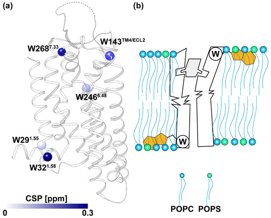 In the crystal structure of A2AAR in complex with ZM241385 [46], W321.58, W143TM4/ECL2, and W2687.33 were all located near the membrane–water interface, with the side chains oriented towards the hydrophobic membrane mimetic. It was noticed elsewhere that tryptophans tend to be located at the bilayer interface of α-helical membrane proteins, where the ordered lipids provide anchor points for interfacial tryptophans through multiple types of molecular interactions [47,48,49]. Thereby, the indole 15N–1H moiety can act as a hydrogen bond donor and form hydrogen bonds with phospholipid headgroups, making indole 15N–1H NMR probes at the lipid bilayer–water interface sensitive to changes in the membrane mimetics. The 1H chemical shift differences between LMNG/CHS micelles and POPC/POPS nanodiscs of 0.25, 0.07, and 0.20 ppm, respectively, for W321.58, W143TM4/ECL2, and W2687.33 (Figure 4b) can be rationalized using the implicated interactions with lipids in these interfacial tryptophan residues.