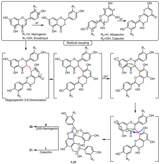 Existing hypotheses regarding the mechanisms of spiro-flavonoid formation require at least two oxidation steps and suggest that these compounds are formed by trapping a putative carbocation intermediate in the oxidative conversion of flavanone to flavonol [30,45], or by radical coupling of two oxidatively generated phenoxyl radicals [7,47]. The hypothesis that assumes the formation of a flat carbocation does not specify how exactly it would be formed. However, the free radical mechanism also produces a flat trigonal radical that can react on either side. In general, the process of formation of spiro-flavonoids may not be directly related to the biosynthesis in the cytoplasm. Their formation outside photosynthetic tissue could be due, as in the case of resveratrol oligomers, to interference with ion transport and related redox processes [100]. Rather, the necessary substrates can be transported across cell membranes to the lignifying zone in the cell wall, where they undergo enzymatic oxidation (dehydrogenation). As in lignin synthesis by radical coupling of monolignols, the enzymes laccase and peroxidase may be involved in this oxidation, but further experimental data should be collected to support these statements [101,102]. Interestingly, Pecio et al. (2023) [7] observed that all spiro-flavonoids isolated from the bark of Y. schidigera and the spiro-biflavonoid fragranol B (8), as well as the spiro-triflavonoid fragranol A (30) from the bark of Anneslea fragrans, have (2R)-naringenin in their structures [37,38], while abiesinoles A-H from the bark of Abies sachalinensis contain (2S)-naringenin or (2S)-eriodictyol [42]. This indicates a certain stereoselectivity in their formation.