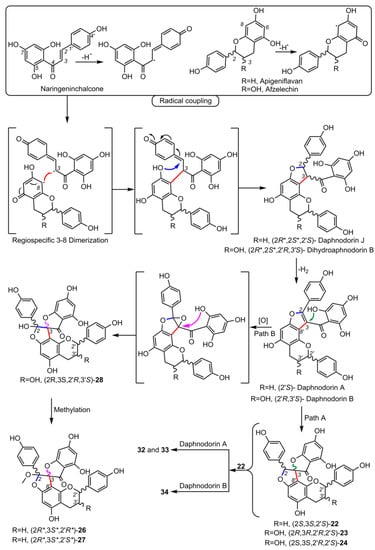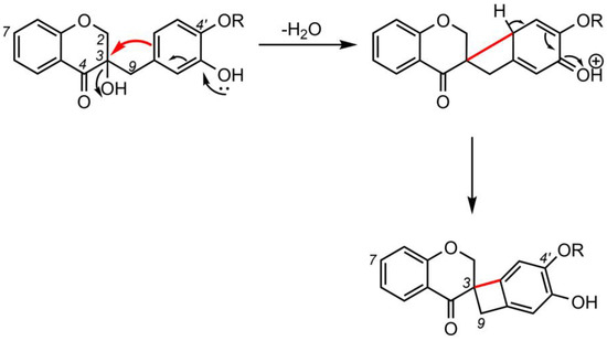 Since studies on the biosynthesis of spiro-flavonoids have not yet been performed, it seems appropriate to present possible mechanisms in light of the knowledge of flavonoid biosynthesis. It is generally accepted that flavonoids are synthesized in the cytosol, and the enzymes involved are connected to the endoplasmic reticulum [80,81]. The pathway begins with the formation of the C6-C3-C6 skeleton by chalcone synthase (CHS), which catalyzes the synthesis of naringenin chalcone from one molecule of p-coumaroyl-CoA and three molecules of malonyl-CoA. In the biosynthesis of flavonoids, the unstable chalcone is stereospecifically converted to the flavanone, (2S)-naringenin, by chalcone isomerase (CHI). In the absence of CHI, the isomerization of chalcone occurs spontaneously, producing the racemic mixture of (2S)-naringenin and (2R)-naringenin, but the enzyme-catalyzed reaction is 107 times faster than the spontaneous one [82,83]. (2S)-Flavanones are the exclusive substrates of downstream enzymes of the flavonoid pathway, and thus CHI guarantees the efficient formation of biologically active (2S)-flavonoid isomers. Interestingly, Arabidopsis mutants lacking CHI activity have been reported to accumulate only trace amounts of flavonoids [84].