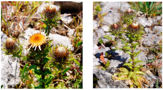 C. vulgaris L. is one of the less studied species from the Carlina genus. However, due to its taxonomic affinity with C. acaulis, it could potentially serve as another source of metabolites with high biological activity. It is a monocarpic perennial plant widespread in central and western Europe, from the southern regions of the Iberian and Apennine Peninsulas to southern Sweden. It primarily colonizes calcareous grasslands [26]. The plant produces a stiff, erect, top-branching stem that can reach a height of up to 80 cm. The leaves are lanceolate, serrated, and strongly spiny. The inflorescence consists of one or several baskets, measuring 3.5–5 cm in diameter (Figure 1).