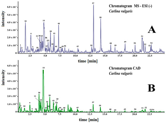 Chromatograms of extracts from C. vulgaris obtained using liquid chromatography with a quadrupole-time-of-flight high-resolution mass spectrometer (LC-HRMS-QTOF) and a charged aerosol detector (CAD). (A)—MS chromatogram (electrospray ionization—ESI); (B)—CAD chromatogram.
