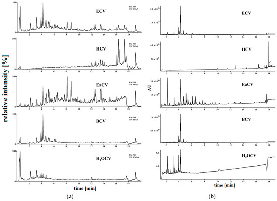 The chromatograms obtained from ultra-performance liquid chromatography with mass spectrometry and electrospray ionization UHPLC-ESI-MS(−) chromatograms (a) and the UHPLC with photodiode detector—PDA (254 nm) (b). Fractions obtained through liquid–liquid extraction from the extract of C. vulgaris. ECV—methanol extract, HCV—hexane fraction, EaCV—acetate fraction, BCV—butanol fraction, H2OCV—water fraction.