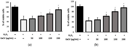 For antioxidant assay, the cells (1 × 105 cells/mL) were seeded on the well bottom in 96-well plates. After 24 h of incubation at 37 °C, the cells were pretreated with the EaCV extract and, after 30 min, H2O2 (250 μM) was added to the medium to induce oxidative stress [56]. Stock solution of the EaCV extract was prepared using DMSO/culture medium (1:1) and appropriately diluted. The final concentration of DMSO did not exceed 0.5%. Cells treated with 0.5% of DMSO in culture medium was taken as control.