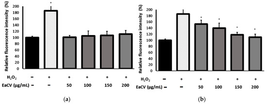 As can be seen, H2O2 strongly induced oxidative stress and the level of ROS significantly increased (up to 184%) compared to the control. In turn, the EaCV extract did not affect the oxidative balance in a statistically significant manner (Figure 6a). Pretreatment with the EaCV suppressed ROS production in H2O2-stimulated cells in a concentration-dependent manner.