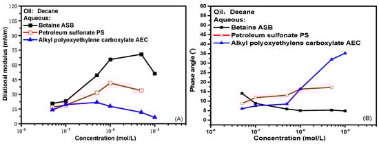 Figure 1 presents the experimental results of interfacial rheological properties of zwitterionic surfactant betaine ASB, anionic surfactant petroleum sulfonate PS and anionic-nonionic surfactant AEC as a function of bulk concentration at 0.1 Hz oscillation frequency, where (A) is dilational modulus and (B) is the phase angle. The dilational modulus is the direct characterization of the interfacial film strength. The dilational modulus of the three surfactants reaches a maximum with the increase of concentration and then gradually decreases. ASB has the highest extreme value, and AEC has the lowest. The difference in the maximum value is caused by the interface arrangement and configuration of the surfactant molecules. For ASB, the behavior of surfactant molecules on the interface in response to interface dilation and compression is the tile and upright of the ion head group. The main body of the diffusion exchange between the interface and the bulk phase is the solvent molecule. A large amount of storage modulus is generated in the interface film, and the film strength is high, which has been explained in detail in our previous work [12,29]. For the two ionic surfactants, the intermolecular interaction on the interface is dominated by repulsive electrostatic force. With the gradual increase of adsorption capacity, the interface deformation often leads to the continuous adsorption and desorption of surfactant molecules at the oil-water interface. The diffusion exchange behavior of surfactant molecules will greatly weaken the strength of the oil-water interface film, and the film strength is low. In contrast, the molecular size of PS is larger, and the diffusion exchange rate is slower, so the maximum dilational modulus is higher than that of AEC. Of course, after all, the dilational modulus is defined as the change of interfacial tension with the interfacial area. When the test concentration is higher than the critical micelle concentration of the surfactant, even the higher interfacial film strength will eventually be covered by the diffusion exchange behavior, and the dilational modulus of the three surfactants will eventually decrease.