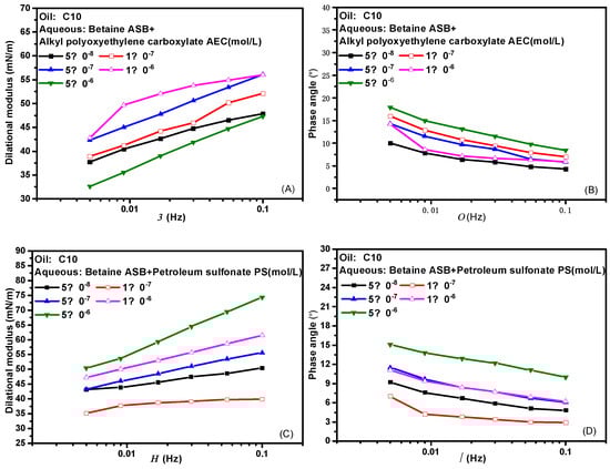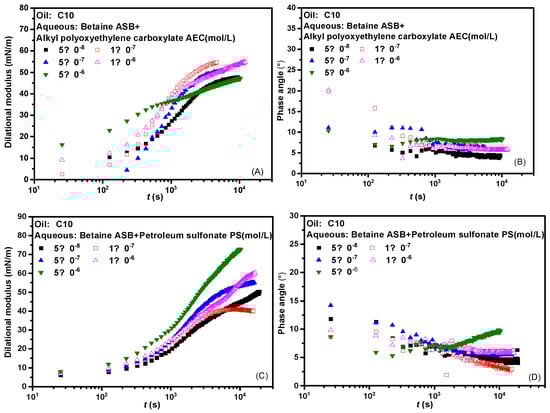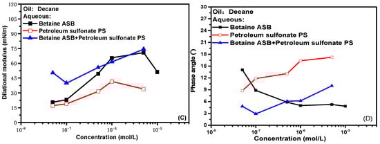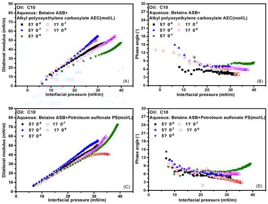 The interfacial pressure is defined as the difference in interfacial tension before and after the adsorption of surfactant molecules. Here, the pre-adsorption refers to the oil-water interface formed by distilled water and n-decane. As mentioned above, while the interfacial tension is a direct characterization of the number of surfactant molecules adsorbed on the interface, the dilational modulus is a measure of the strength of the interfacial adsorption film. It is not only related to the adsorption amount but also determined by the intermolecular interaction and various relaxation processes. For the same surfactant solution with different concentrations, the adsorption amount and interfacial film structure are the same when the interfacial pressure is the same. If the modulus values are not much different at this time, the properties of the adsorption film are mainly determined by the relaxation process in the film; if the modulus values differ greatly, it indicates that there is a molecular escape from the interface, and the diffusion exchange process dominates the properties of the interface film. Typically, the insoluble film formed by the protein at the gas-liquid interface or the oil-water interface, the interface pressure-modulus curves at different concentrations are completely coincident [36,37,38]. Therefore, the dispersion degree of the dilational modulus-interface pressure curve of surfactant solutions with different concentrations can be used as a characterization of the contribution of the diffusion exchange process. In Figure 6A,C are the dilational modulus-interface pressure curves of the complex system formed by betaine and two ionic surfactants at different concentrations, and Figure 6B,D are the corresponding phase angle-interface pressure curves. As the interfacial pressure increases, the number of surfactant molecules adsorbed on the interface increases, while the phase angle is always very small, which means that the properties of the adsorbed film have always been determined by the relaxation process in the film. In addition, the dilational modulus-interfacial pressure curves of the two compound systems at different concentrations are relatively concentrated. Among them, the compound system of betaine and petroleum sulfonate is more compact at high concentrations, indicating that the relaxation process in the film of this system is more complicated at that time. All of these confirm our hypothesis and the inference of interface arrangement mechanism.