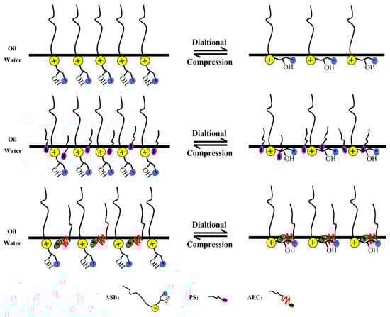 Comparing the maximum values of the dilational modulus in Figure 4A,C, the maximum value of the modulus becomes smaller after the betaine is compounded with the anionic-nonionic surfactant AEC after compounding with petroleum sulfonate PS, and the maximum modulus even increases slightly. This is due to the fact that the combination of surfactants is bound to bring competitive adsorption on the interface. The “flat configuration” of the oxyethylene group in AEC will occupy a certain space size [20,34,35], which reduces the number of betaine molecules adsorbed on the oil-water interface to a certain extent, and the dilational modulus will naturally decrease. Compared with AEC, PS has a smaller molecular size, and it will insert adsorption vacancies without affecting the adsorption capacity of betaine, further increasing the tightness of the adsorption film, and the dilational modulus increases. The specific mechanism is shown in Figure 5.