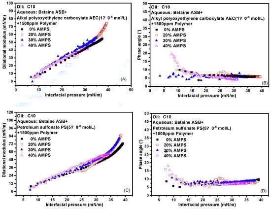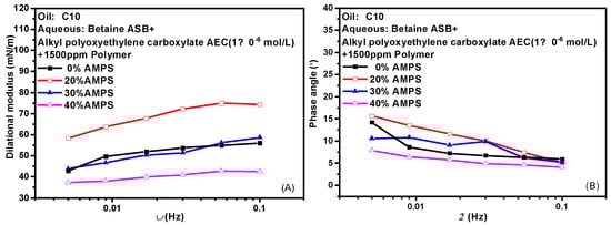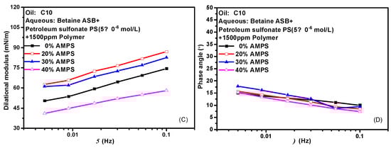 Hydrophobically modified polyacrylamide (HMPAM) is a graft copolymer obtained by introducing a small amount of 2-acrylamido-2-methylpropanesulfonic acid (AMPS) based on hydrolyzed polyacrylamide (HPAM) [39,40,41]. The content of AMPS in the bulk phase means the degree of hydrophobic modification of the hydrolyzed polymer. HMPAM often has certain interfacial activity and can mix even compete adsorption with surfactant molecules at the oil-water interface. Figure 7 shows the variation of the interfacial dilational properties of the complex system formed by betaine and two ionic surfactants with frequency after the addition of polymers with different AMPS contents. Figure 7A,C are the dilational modulus, and Figure 7B,D are the phase angle. HMPAM is a macromolecule with a molecular weight of more than 107. It has a long characteristic time of diffusion and exchange, and it is generally believed that there is only the relaxation process at the interface. However, according to the model proposed by Noskov et al. [42,43,44,45], although the diffusion and exchange process of polymer macromolecules from bulk phase to surface layer can be ignored, the diffusion and exchange process of monomer molecules between different positions of surface layer must be considered. By analyzing the modulus-frequency curves of the two composite systems, we found that in the test frequency range, as the AMPS content in the polymer increases, the value of the dilational modulus increases first and then decreases. When a small amount of hydrophobic monomers are present, the absorbed macromolecules have an almost flat two-dimensional conformation, do not form long rings and tails, and are all concentrated at the oil-water interface. The interfacial dilational compression leads to intra-film slow relaxation processes such as the deformation of polymer molecular chains. At the same time, the interaction between surfactant molecules and hydrophobic blocks at the interface is continuously enhanced, and the dilational modulus increases. With the increase of AMPS content, the surfactant molecules on the interface can form aggregates similar to mixed micelles with the hydrophobic blocks of the polymer. When the interface area increases, the surfactant molecules in the above-mixed micelles can be quickly released, and the interfacial tension gradient can be quickly eliminated in situ in the interface layer, thus greatly reducing the interfacial dilational elasticity [24,46]. It is worth noting that even if the content of AMPS reaches 40% and the dilational modulus reduced to 40 mN/m, the value of the phase angle is still very small, indicating that the strength of the interfacial film must be supplemented in some way to offset the viscous increase caused by diffusion exchange.