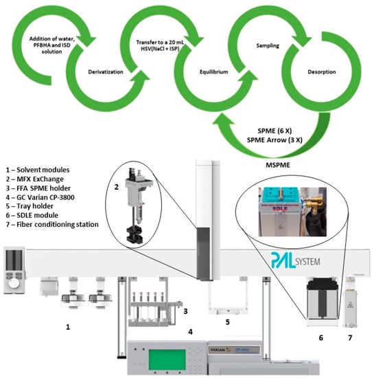 Automation of the analytical procedure was achieved using a CTC PAL3 System xyz Autosampler (CTC Analytics AG Industrie Strasse 20 CH-4222, Zwingen, Switzerland) with a 1200 mm bar. The apparatus was equipped with a Multi Fiber eXchange (MFX) system (Chromline, Prato, Italy), Liquid Syringe Tool (CTC Analytics AG, Zwingen, Switzerland), SPME dual layer extraction (SDLE) equipped with Chronos software (Chromline, Prato, Italy), an FFA-SPME holder, a tray with 20 mL and 2 mL slots, a fiber conditioning system, two solvent modules (one for 100 mL solvent bottles and the other for 10 mL solvent bottles), and a wash module, to guarantee an automated routine between the exchange of syringe, FFA-SPME, and FFA-SPME Arrow fibers, and shift between traditional SPME and cooling SPME sampling.