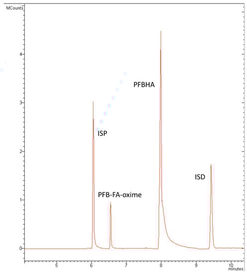 Total ion current chromatogram in EI mode, showing ISP, PFB-FA-oxime, PFBHA, and ISD.