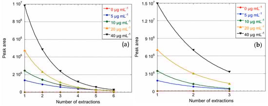 where Ai is the peak area obtained in the ith extraction. To obtain a linear trend in the logarithm of peak areas, Tena et al. suggested that the analyte loaded on the fiber must be considered in relation to its concentration—β has an influence since it should be below 0.95 to achieve at least a 5% difference in two consecutive areas, whereas values below 0.4 allow for calculating the analyte simply with a sum of the areas since four extractions provide a recovery above 97% [].