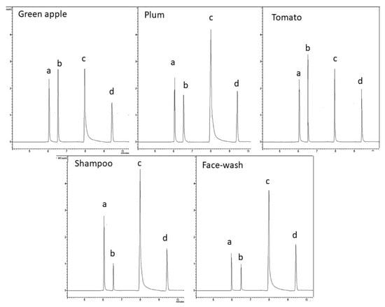 Chromatograms of real samples (green apple, plum, tomato, shampoo, and face wash) analysis: ISs (a and d), PFB-FA-oxime (b), and PFBHA (c) peaks.
