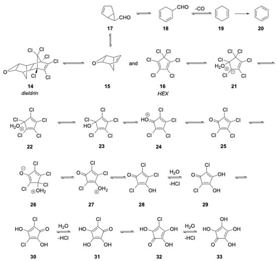 A proposed mechanism of degradation of dieldrin is shown below in Figure 2. It is very likely that the first critical step is a retro Diels–Alder reaction to result in norbornadiene oxide and hexachloropentadiene (HEX). Norbornadiene oxide can rearrange to benzene and CO, as shown []. At these temperatures, the addition of water to the highly reactive HEX should easily lead to tetrachlorocyclopentadienone [], which can undergo a series of addition/elimination reactions with water (or hydroxyl radical) to form a series of highly polar (and almost certainly water soluble) compounds. The degradation of the product and its tautomers has been studied under acidic conditions [].
