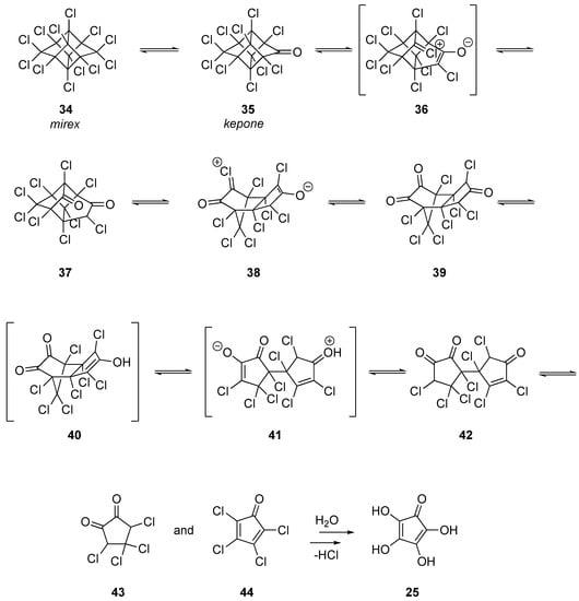 The mechanism of the degradation of mirex is well-established to begin with hydrolysis to kepone as shown in Figure 4 []. The cleavage of the highly strained four-membered rings can be considered to be analogous to a retro-aldol, ultimately resulting in the tricyclic norbornadiene with a fused cyclopentanone. Two additional retro-Michael reactions result in two monocyclic compounds that can undergo successive addition/elimination reactions of water (or hydroxyl radicals if present) to generate the tetrahydroxycyclopentadienone, the decomposition of which is referenced above for dieldrin.
