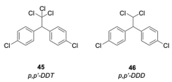 DDT is perhaps the most well-known chlorinated pesticide due to the highly publicized discovery of the deleterious effects this compound has on wildlife in the late 1960s. Prior to 1972, this compound was the most commonly used pesticide in agricultural practices. The use of this pesticide in the United States was banned in 1972. DDT itself is not often as persistent in the environment as its dechlorinated byproducts, DDD and DDE []. EPA has targeted all three compounds as priority pollutants due to their persistence and potential health risks. These compounds are all probable carcinogens and bioaccumulate up the food chain. They also can persist up to 15 years within the soil before beginning to degrade under natural conditions. DDD was chosen for the next experiment because it is such a prevalent pollutant in areas previously contaminated by DDT. The structures of p,p′-DDT and p,p′-DDD are shown in Figure 5.