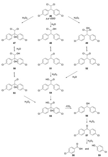 The proposed mechanism for the degradation of DDD is shown below in Figure 6. The most likely pathway is the initial hydrolysis and formation of the aldehyde shown in the upper part of the figure. In the absence of an oxidant (or a limited amount of dissolved oxygen), it is likely that slow decarbonylation or the limited oxidation of that aldehyde will lead to a radical degradation pathway, implicating a number of the intermediates shown. The presence of added oxidant will likely speed the decomposition of many of those intermediates, ultimately leading to the p-chlorobenzoic acid and p-chlorophenol shown, which will degrade as discussed in the generic mechanism shown earlier. The degradation of DDT discussed below is likely to follow a similar pathway since a major product of decomposition of DDT is DDD.