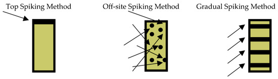 Yet, another approach was attempted in the event pollutant volatilization was found to be significant during the off-site spiking method. This approach, the gradual spiking method, was one in which the compounds were spiked as the extraction vessel was filled with sand. This method was investigated in the hopes of minimizing any potential volatilization, while more evenly distributing the pollutants throughout the vessel than the traditional top spiking method. Figure 7 is a visual representation of the pollutant distribution in the vessel after each spiking method.