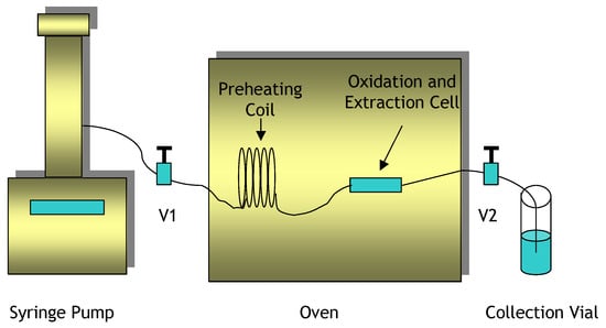 Once connected to the system, V2 was closed, and the vessel was pressurized to 15 atm by operating the syringe pump in the constant pressure mode. This step allowed a check for leaks in the system, while also supplying sufficient pressure to keep the water in the liquid state during the subsequent heating step. After finding no leaks in the system, V1 was closed, and the extraction vessel was placed inside the oven. A static oxidation and extraction step was performed for a specified amount of time with both V1 and V2 closed. At the end of the static step, V2 was opened, the pump was engaged in the constant flow mode at a flowrate of 0.5 mL/min, and V1 was opened. This dynamic extraction step was performed for 10 min, with 5 mL of the effluent water being collected in a vial. After 10 min, the extraction vessel was removed from the oven and the pump was turned off. After allowing the vessel to cool, it was disconnected from the oxidation and extraction system.