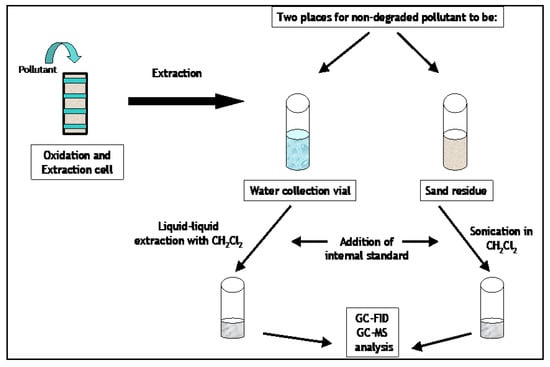 Quantification of the amount of pollutants left after the oxidation and extraction processes were completed using the GC-FID. In preparation for GC analysis, the water effluent collected during the dynamic extraction step underwent a liquid–liquid extraction with methylene chloride, while the sand residue was sonicated in methylene chloride to remove residual pollutants. Figure 9 is a simple schematic of the analysis procedure that is described in further detail in the following paragraphs.
