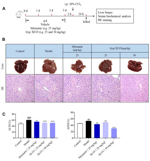 Protective effects of XLVI on CCl4 induced liver injury: (A) experimental model of acute liver injury; (B) representative images of intact livers and HE staining (20×) in each group; and (C) serum ALT, AST level (n = 8), ## p < 0.01, ### p < 0.001 versus Control group, * p <0.05. ** p < 0.01, *** p < 0.001 versus Model group. Data are presented as mean ± SD.