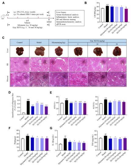 Next, the chronic liver injury mice model was established to further evaluate the protective effect of XLVI (3, 10, and 30 mg/kg) in hepatic fibrogenesis. Due to the strong toxicity of CCl4, it was combined with alcohol to induce chronic liver injury as well as to reduce adverse reactions and mortality rates [15]. As depicted in Figure 2A, the livers collected from the CCl4 group were stiff and puffy, with an irregular and granular boundary, and the liver weight/body weight (LW/BW) ratio was significantly increased. The histopathological changes of HE staining showed disorder of the lobular architecture, steatosis of large number of hepatic cells, infiltration of inflammatory cells, and disturbance of the hepatic cord arrangement. In the XLVI and silymarin-treated groups, these symptoms were clearly mitigated (Figure 2B,C). The Masson’s trichrome-stained liver sections of each group revealed that there was a significantly increased fibroplasia area percentage in liver sections of the model group (Figure 2D), and that XLVI reversed the fibrotic area in a dose-dependent manner. Biochemical indexes showed that XLVI and silymarin reduced the levels of serum transaminase AST, ALT, and HYP at the same time (Figure 2E,F). In addition, XLVI also inhibited the upregulation of the typical inflammatory factors, such as TNF-α and IL-1β (Figure 2G). In summary, XLVI alleviated liver damage and reduced collagen deposition caused by long-term stimulation of CCl4 and alcohol in vivo.