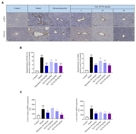 Since α-SMA and COL1A1 are marked as key proteins in the activation of HSC and the development of fibrosis, we next examined their levels in the tissue collected from the chronic liver injury mice. Immunohistochemical results showed that the positive areas stained with α-SMA and COL1A1 antibodies were significantly increased in the model group compared with the blank group, which indicated that CCl4 and alcohol-induced injuries successfully promoted the expression of α-SMA and COL1A1 and the process of liver fibrosis. In the XLVI treatment groups, the deposition region of ECM was clearly reduced in a concentration-dependent manner (Figure 3A,B). qPCR analysis further verified that Col1a1 and α-Sma levels were inhibited in the liver tissues, especially in the high-dosage group treated with XLVI (Figure 3C).