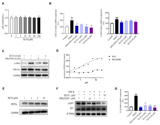 XLVI inhibited TGF-β1 stimulated LX-2 cells activation: (A) cell viability test; (B) expression of COL1A1 and α-SMA in LX2 cells was detected by Western blot analysis; (C) qPCR results of COL1A1 and α-SMA; (D) PP2Cα agonist activity of XLVI; (E) expression of PP2Cα in LX2 cells was detected by Western blot analysis; (F) expression of p65 and p-p65 in LX2 cells was detected by Western blot analysis; and (G) qPCR analysis of IL-1β. # p < 0.05, ### p < 0.001 versus Control group, * p <0.05. ** p < 0.01. *** p < 0.001 versus Model group. Data are presented as mean ± SD.