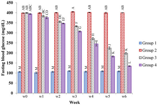 The fasting blood glucose level was measured by glucometer weekly through the tail prick method up to six weeks of the experiment. The serum glucose and insulin concentrations were estimated by a rat glucose assay kit (81693, crystal chem, Elk Grove Village, IL, USA) and an insulin ELIZA kit (ELR-insulin, RayBio®, Peachtree Corners, GA, USA). Glycosylated hemoglobin was estimated using a rat hemoglobin Hb1Ac assay kit (MBS2033689, My BioSure, Grass Valley, CA, USA). The serum triglyceride, high-density lipid (HDL), low-density lipid (LDLs), and cholesterol levels were calculated using commercially available kits (ab65359, ab65336, and ab65390, respectively; Abcam, Cambridge, UK). The serum level of liver function enzymes, i.e., alanine aminotransaminase (ALT) and aspartate aminotransferase (AST), were determined through the kit assay method (ab105134/k752-100 and ab105135, respectively; Abcam, Cambridge, UK).