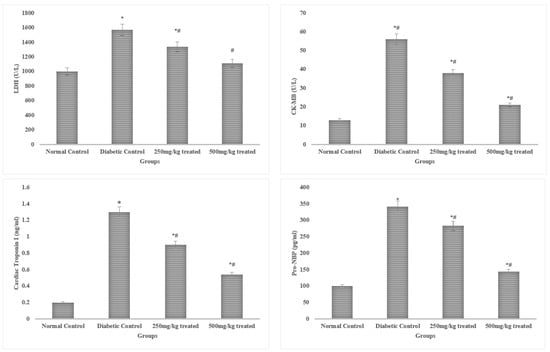 Effects of the JSP extract on cardiac biomarkers. * Significant (p < 0.05) difference among the normal control and other groups. # Significant (p < 0.05) or *,# highly significant (p < 0.01) difference among the diabetic, control and treated groups.