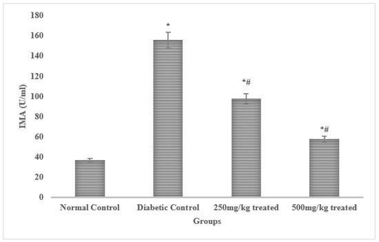 Serum levels of LDH, troponin, and CK-MB are frequently utilized to detect cardiac myopathy, in addition to cardiac dysfunction. The rats exposed to alloxan had considerably higher (p < 0.05) serum CK-MB, troponin I, and LDH levels than the non-stimulated control rats. The elevated levels of the aforementioned indicators were remarkably (p < 0.05) controlled by the JSP extract therapy. However, a higher dose (500 mg/kg) produced more pronounced (p < 0.01) results than a lower dose, resulting in recovery of cardiac function and decreased cardiac myopathy. The progenitor of brain natriuretic peptide (pro-BNP) has been found to be increased in left ventricular deterioration. This peptide’s high production has been linked to coronary artery disease. Serum natriuretic peptide and IMA levels were effectively elevated (p < 0.05) compared to the control group in the rats after diabetes induction. The results indicate that a higher dose of the JSP extract produced highly significant effects (p < 0.01) in the treated group by efficiently dropping the serum levels of IMA and pro-BNP compared to the diabetic control group. The low dose (250 mg/kg) of the JSP extract also reduced (p < 0.05) the serum IMA and pro-BNP levels compared to the diabetic control group, but the effect was low compared to the 500 mg/kg dose (Figure 2).