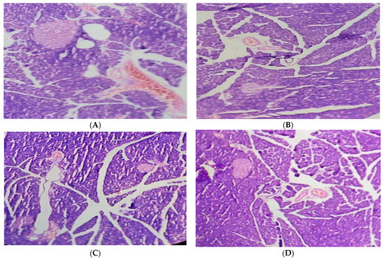 (A) Pancreas of the normal control group with normal histological islets of Langerhans, including active nuclei. (B) Pancreas of the diabetic control group with inflammatory and necrotic alteration in β-cells, cellular infiltration, vacuolization, congestion, and atrophy. (C) Pancreas of the 250 mg/kg-treated group with improvement in cellular damage and congestion. (D) Pancreas of the 500 mg/kg-treated group with an increased volume of islet cells and regeneration of β-cells.