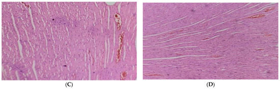 (A) Cardiac tissue of the normal control group with normal histology of cardiac myofibril. (B) Diabetic cardiac tissue showed fibrosis and disrupted and degenerating muscle fibers with extravagated blood vessels. (C) Cardiac tissue of the 250 mg/kg-treated group with partial improvement of disrupted elastic fibers and enlarged myofibrils. (D) Cardiac tissue of the 500 mg/kg-treated group showed reversal of cardiac injury with a lesser degree of myocardial damage and mild edema.
