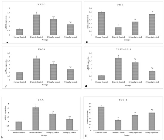Myocardial gene expression profile of the rats: mRNA expression of (a) Nrf-2, (b) Bax, (c) Bcl-2, (d) Caspase-3, (e) HO-1, and (f) iNOS. * Significant (p < 0.05) difference among the normal control and other groups. # Significant (p < 0.05) difference among the diabetic, control and treated groups.