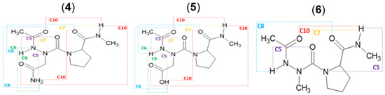 The conformational preferences of azaamino acid residues have been studied theoretically [15,16,17,18,19,20,21] and experimentally [22,23,24,25,26,27,28,29,30,31]. The results showed that the preferred dihedral angles of the backbone of these azaamino acid residues are in the range of ϕ = ±90° ± 30°, ψ = 0° or ±180° ± 30°, which is appeared to be the polyproline II (βP), and β-turn motif (αR, αL, δR, or δL conformation) [15,16,17,18,19]. The nomenclature was denoted by Karplus et al. [32]. Our groups and others examined the effect of azaamino acid residue on the structures of peptides [33,34,35,36,37,38]. For example, the azaglycine adopted the polyproline II (βP) in azaGly-Pro-Hyp (hydroxyproline) of the collagen [39]; the δL conformer (ϕ = 90° ± 30°, ψ = 0° ± 30°) in Ac-Phe-azaGly-NH2, forming the βII-turn structure; the αR or αL conformer (ϕ = ±90° ± 30°, ψ = 0°) in Ac-Aib-azaGly-NH2, adopting βI or βI′-turn [40]. Meanwhile, incorporating azaamino acids destabilized the β sheet secondary structure compared to the parent peptide [41]. The results showed that the conformational preference of azaamino acid residue in peptides should be sequence dependence. However, it is still largely unknown of these questions: why azaamino acid residue adopts a specific conformation in the context dependence, the influence of the side chain of azaamino acid residue on its backbone structure, and the neighboring effect on the conformational behaviors of azapeptides. As a part of the efforts to answer these questions, we previously examined the conformational properties of tripeptides, Ac-Pro-azaXaa-NHMe [Xaa = Asn (1), Asp (2), Ala (3)] using the DFT method, showing that the azaamino acid in this sequence, regardless of the side chain, adopts βII (βII′) turn structure [21]. Additionally, we also suggested the importance of the side-chain and main-chain or main-chain and main-chain HBs found in these model peptides on the stability of the azapeptides. In this work, we extended our ongoing efforts in understanding conformational properties of short azapeptides containing three azaamino acid residues, Ac-azaXaa-Pro-NHMe [Xaa = Asn (4), Asp (5), and Ala (6)] (Figure 1). While previous theoretical studies focused on the dipeptide models [14], we wondered about the position effect of azaamino acid residue in tripeptides. We used the popular DFT functionals, B3LYP and B3LYP-D3 [42], to compare our previous work [21] in the gas phase and water. The solvation effect was calculated with the SMD method [43]. We also investigated the influence of the cis-trans isomerization amide bonds on the conformational preferences of model peptides.