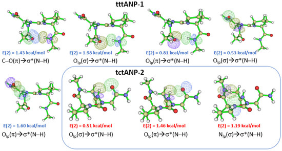 Figure 3. NBO overlaps of tttANP-1 and tctANP-2 in the gas phase. ‘t’ and ‘c’ represents ‘trans’ and ‘cis’ amide bond, respectively. The E(2) value is shown in blue color for B3LYP and red color for B3LYP-D3 functional.