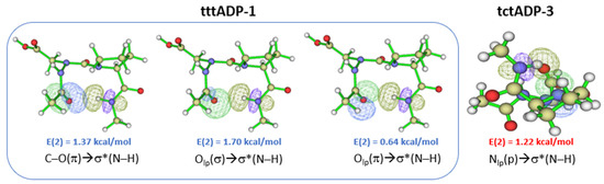 Figure 4. NBO overlaps of the lowest energy conformer tttADP-1 (@B3LYP) and tctADP-3 (@B3LYP-D3) in the gas phase. The E(2) value is shown (See Supporting Information Tables S14 and S17).